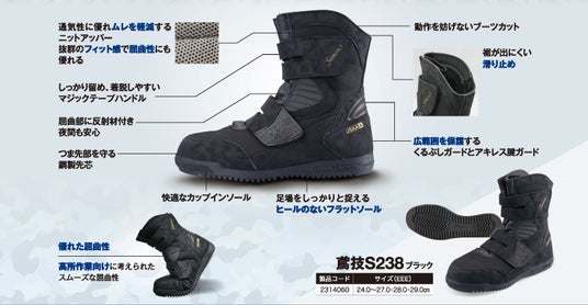 株式会社シモン(本社:東京都中央区 代表取締役:利岡和範)は2025年6月にプロテクティブスニーカー※鳶技シリーズの新モデル「鳶技S238ブラック」を発売します。鳶技シリーズはJSAA規格認定の安全性やデザイン性が評価され多くのユーザー様に支持されており、高所作業用のみならずさまざまな現場で広く使用されています。「鳶技S238ブラック」は既存モデルよりも丈を短くし、ポリエステル製ニットアッパーを採用。抜群のフィット感と通気性・屈曲性を実現しました。※プロテクティブスニーカーとは、公益社団法人日本保安用品協会(略称:J SAA)が制定する「一定の安全基準や耐久性」を有する軽作業に適したプロテクティブスニーカー規格(通称:JSAA規格)認定作業靴です。