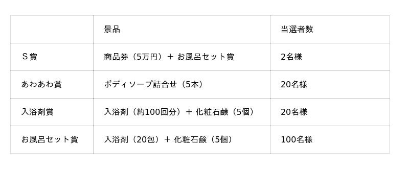 今回のキャンペーンは、日本浴用剤工業会が日本石鹸洗剤工業会の協賛を受けて、クイズに正解いただいた方の中から、抽選で下記の景品を合計142名様にプレゼントいたします。