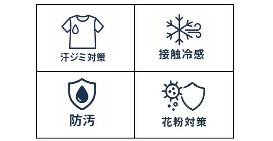 汗ジミが出にくい、防汚、花粉対策、接触冷感の機能があります。