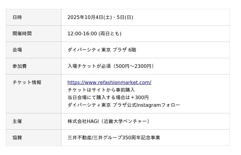 「RE FASHION MARKET」は2025年10月4日(土)、5日(日) ダイバーシティ東京 プラザ6Fにて、