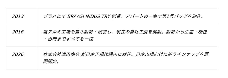 チェコ・プラハを拠点とするバッグブランド「BRAASI INDUSTRY(ブラーシ インダストリー)」は、2026年4月より株式会社津田商会(神戸市)を日本正規代理店として新体制をスタートし、新ラインナップを日本市場へ展開することを発表いたします。