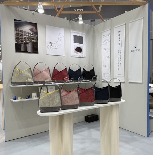 本展示では、日本の伝統素材「紙布(しふ)」と、広島・尾道の鉄鋼所で発生する廃棄予定の鉄粉を活用し、尾道帆布へプリントを施したアップサイクル素材の新シリーズを初披露。持続可能な素材開発と現代デザインを融合させたプロダクトとして注目を集めました。