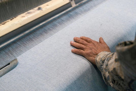 染めから織りまでを一貫して手がける、静岡県の「辻村染織」の藍染め生地を使用。生地になってから染めるのではなく、糸を束にした状態で染める「カセ染め」にこだわり、職人が毎日の気温や湿度に合わせて調整しながら、藍の色を追求しています。絣染めした綿糸と濃淡2色の麻糸を使用して織り上げた「雨絣(あまがすり)」が、繊細でみずみずしい表情を生み出します。