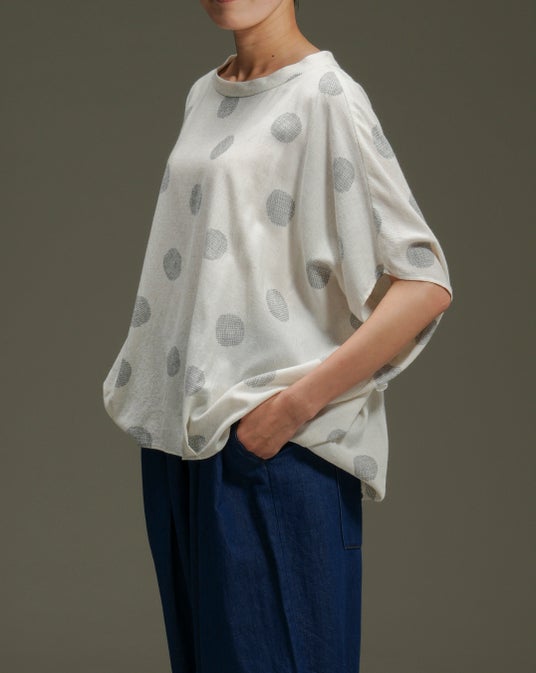 綿糸にレーヨン麻の混紡糸を織り合わせた生地は、肌をすべるようにさらっとしなやか。陽光の季節にも、上品な涼やかさを醸し出します。風をはらむビッグシルエットが華奢見えを叶え、「マンガン絣」の繊細な柄と相まって、大人の女性らしさを感じさせる一着です。