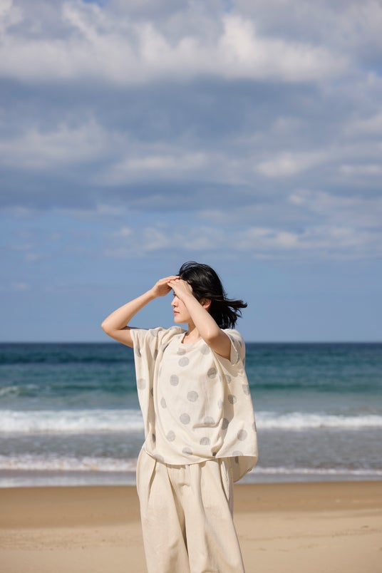 綿や麻といった天然素材に、つくり手が磨いてきた技と知恵を重ねて、心地よい「涼」を呼び込みます。風が抜けやすい織り方、生地が肌にはりつかない工夫、そして風をふわりとはらむシルエット。全国のつくり手たちと二人三脚で仕立てた服は、そよ風が肌を吹き抜けるような爽やかさを叶え、着る人の夏の毎日をやさしく彩ります。
