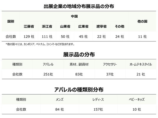 「AFF TOKYO 2025夏」の出展傾向をご紹介しましょう。2025年5月28日現在で出展企業の地域分布、展示品分布、種類別分布は次のようになっています。