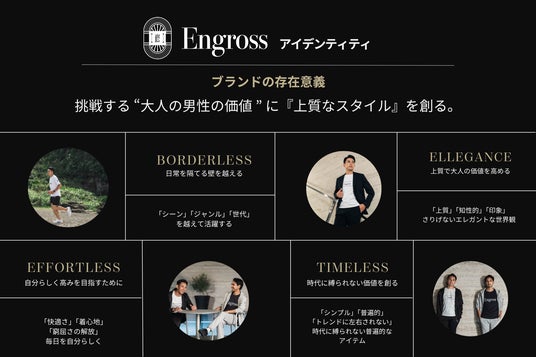 Engrossは、挑戦を続ける “大人の男性の価値をスタイルで支える” というコンセプトに、「陸上競技」にインスパイアされた機能性と哲学、『シーンを超えたアスレジャーファッション』というテーマで誕生したエフォートレス・エレガンススタイルのファッションブランドです。