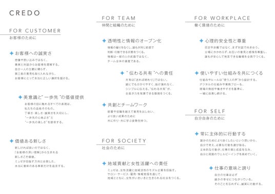 ・クレド:FOR CUSTOMER/TEAM/WORKPLACE/SELF/SOCIETY の5領域