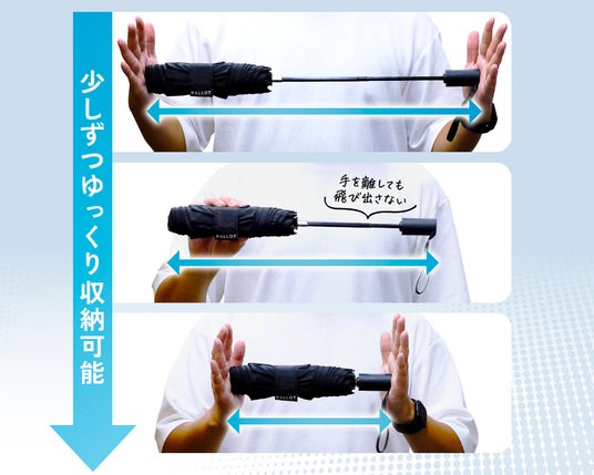 BALLOT自動開閉折りたたみ傘はワンタッチで使用可能。開閉に手間取らないので、雨の日のストレスを大幅に軽減します。