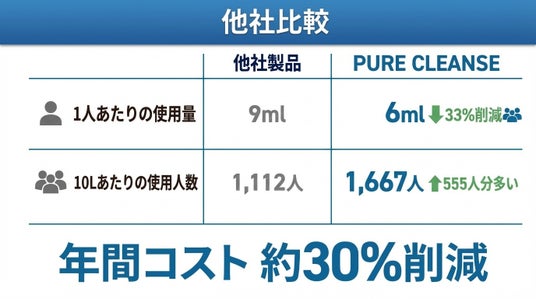 PURE CLEANSE(ピュアクレンズ)は、1人あたりの使用量約30%削減を実現。使用量を抑えてもゲスト満足度を維持し、ボトル1本あたりの使用回数増加によるランニングコスト削減を可能にします。