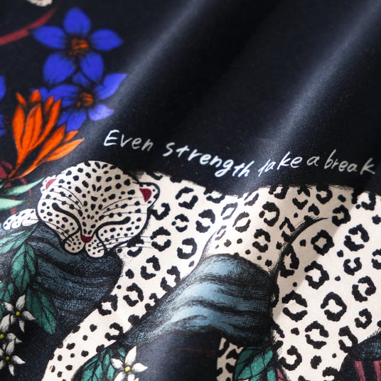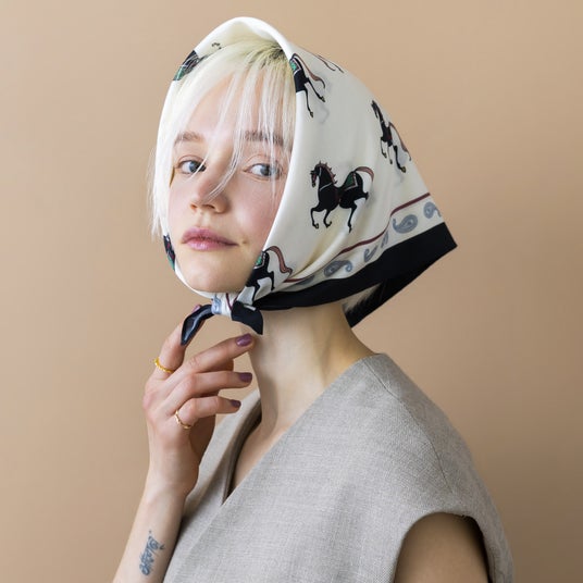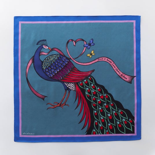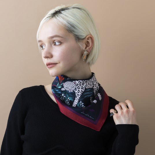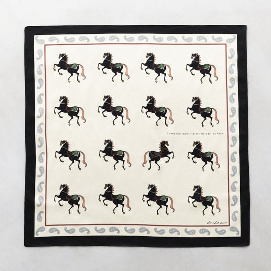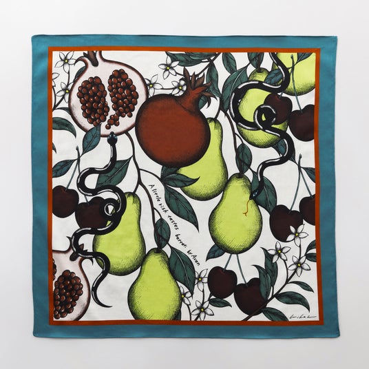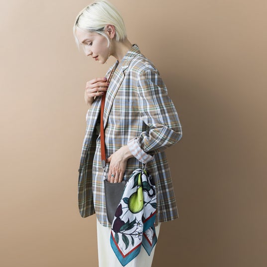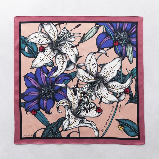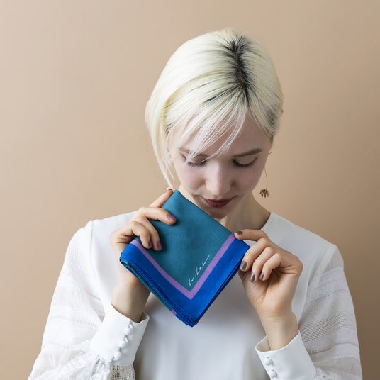 綿100%・日本製の上質な手触りを基本としながら、上品さの中にひとさじのユーモアと違和感を添えます。全型53×53cmの大判サイズで、ハンカチとしてはもちろん、バッグにつけたり首元に巻いたり--スタイリングにも取り入れられる一枚です。