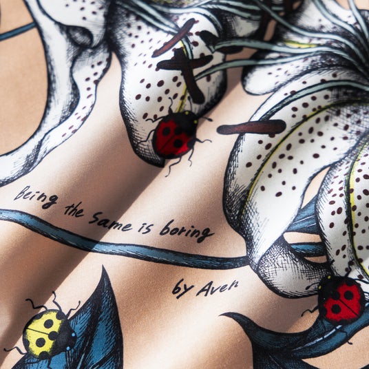 ブランドプロデューサーは、コロナ禍を経てハンカチを集めるようになり、友人と「これ可愛くない?」と見せ合う体験がブランドの原点に。「ただ可愛いだけでもない、メッセージを潜ませたハンカチを作りたかった」--そのこだわりがAvenを生みました。数多くのアーティストの中から今回のイメージに最も近い表現者を探し求め、たどり着いたのがMIHO MURAKAMIでした。