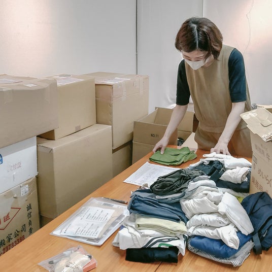 倉敷市児島にある染工場から戻ってきた衣類を地域のお手伝いさん達と本部で仕分けしている風景