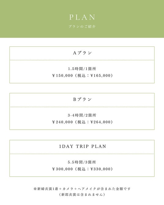 - 当日:ホテルや店舗でお仕度(約1.5~2時間)→撮影→現地解散