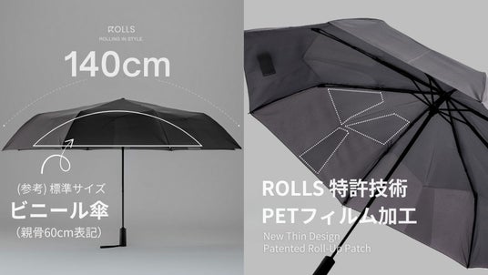 濡らさない親骨サイズ140cm。内側にROLLS特許技術PETフィルム加工で即時収納。