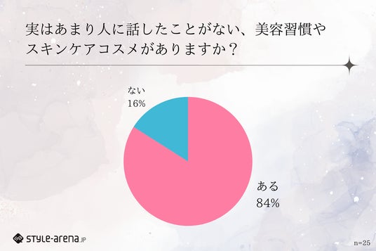はじめに、「実はあまり人に話したことがない、美容習慣やスキンケアコスメがあるか」聞いたところ、「ある(84%)」「ない(16%)」と回答。「SNSには載せてないけど、毎日絶対やってる」「7年以上、ずっと続けてる」。そんな“自分だけの美容習慣とスキンケアコスメ”を持つ方が8割以上という結果になりました。では実際に、「どんなことを実践したり、どんなスキンケアコスメを愛用しているのか」を聞いてみました。
