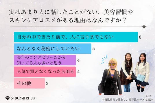 美容習慣もスキンケアコスメも、日々の当たり前になっているからこそ、わざわざ共有しない。その背景にはしっかり効果を感じていたり、テンションの安定に欠かせなかったりする理由があるようです。