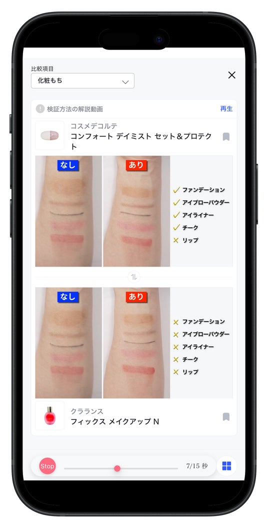 メイク崩れが気になる夏に向けて、以下の3観点で29商品の違いを動画と数値で見える化しました。- 化粧もち:ファンデーション・チーク・リップなど5種の化粧品のキープ力を比較