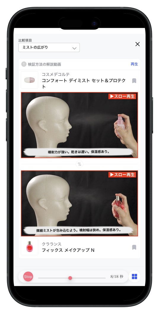 本検証では「化粧もち」「ベタつき」「ミストの広がり」の3項目を独自に測定し、全動画15秒以内で検証・見える化。韓国コスメを含む人気商品が一目で比較でき、SNSでは既に話題を呼んでいます。