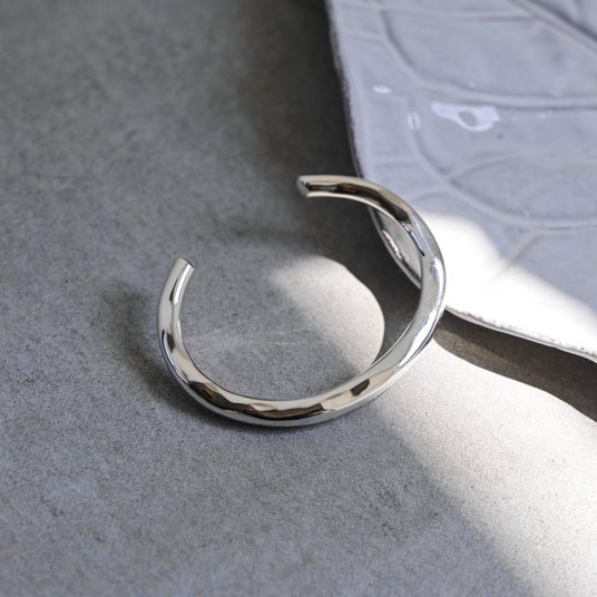 グレインバングルは、自然界の粒子や木々の持つ繊細なテクスチャからインスピレーションを受けたアイテムです。シルバー925を贅沢に使用し、素材の質感を巧みに表現したデザインは、シンプルながらも確かな存在感を放ち、腕元にさりげないアクセントを与えます。