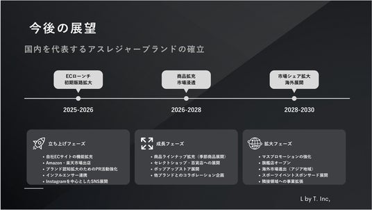 株式会社L by T(本社:東京都港区、代表取締役:岡田 健史)は、2025年7月にアスレジャーブランド「Engross」を立ち上げ、同月10日から8月20日までの期間、“アタラシイモノ” や体験の応援購入サービス「Makuake」にて先行予約販売を行いました。ご購入いただいた皆様へ心より感謝するとともに、10月よりアパレル事業を本格的に展開してまいります。