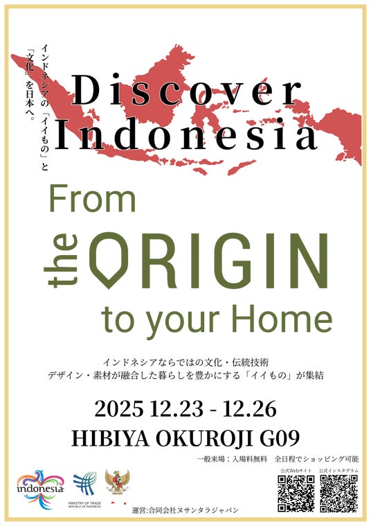 合同会社ヌサンタラジャパン(本社:神奈川県、代表:阿部 安紀子)は、駐日インドネシア共和国大使館とのコラボレーションイベント Made In Indonesiaの商談会「Discover Indonesia From the ORIGIN to your home」を2025年12月23日(火)~26日(金)の4日間、日比谷OKUROJIにて開催いたします。