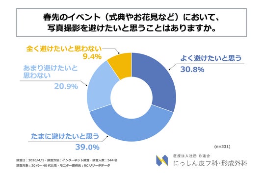 卒業式や入学式、新生活のスタートなど、春はイベントが重なり「人に会う」「写真に写る」機会が急増する季節です。同時に、花粉や寒暖差、黄砂などの影響により、肌のゆらぎや不調を感じやすい時期でもあります。第一印象や写真写りへの意識が高まる中、春特有の肌トラブルが重なることで、本来は楽しいはずのイベントで「写真に写りたくない」「加工なしでは人前に出られない」といった心理的な負担を感じ、写真撮影などの行動を回避してしまう女性は少なくないと考えられます。しかし、季節的な肌不調が、写真撮影の回避といった具体的な対人行動にどのような影響を及ぼしているのか、その実態を定量的に示したデータは不足しています。そこで、医療法人社団 日進会 にっしん皮フ科・形成外科は、20代~40代女性を対象に「春先の肌不調が対人行動に及ぼす影響に関する調査」を実施しました。