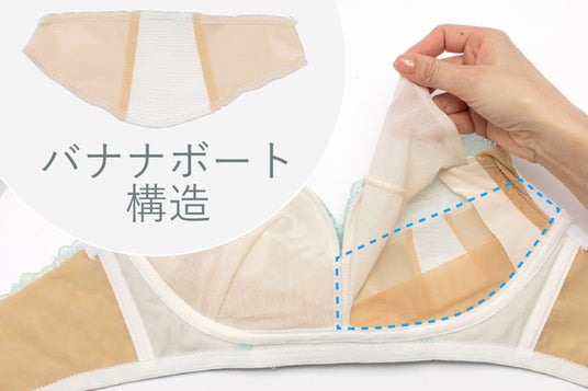 2、まるでオーダーメイドのようなフィット感(バナナボート構造)バストの形に合わせて自在にカップ内のバスト容量をアジャストするバナナボート構造(特許出願中)を開発。まるで自分のためにあつらえたような驚きのフィット感を実現します。