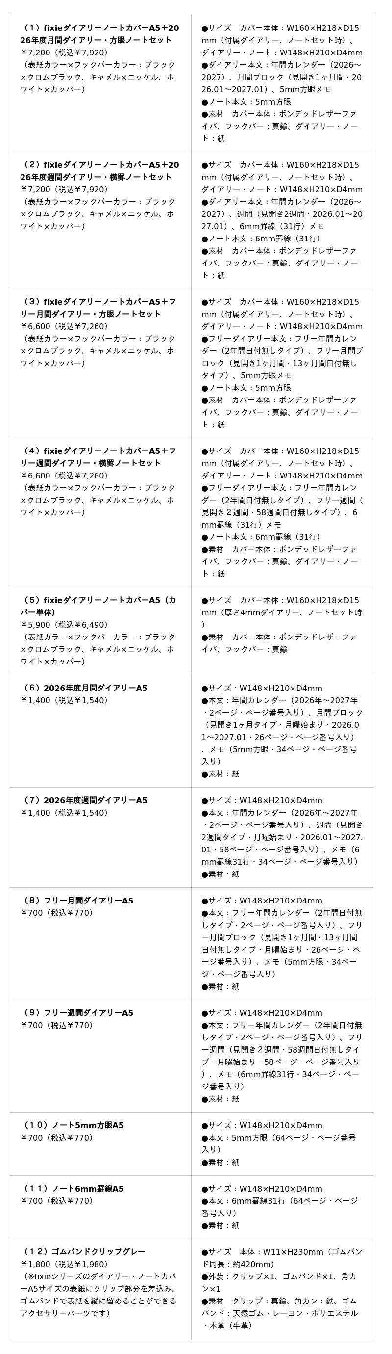 11月14日(金)発売の製品は「カバー+ダイアリー・ノートセット×6種」「カバー+フリーダイアリー・ノートセット×6種」「カバー単体×3種」「ダイアリー単体×2種」「フリーダイアリー単体×2種」「メモノート単体×2種」「アクセサリパーツ×1種」の全22SKUです。