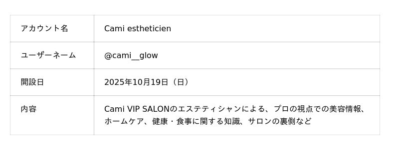 Cami株式会社(本社:東京都港区、代表取締役:土屋可奈)は、新たなプロデュースプロジェクト第一弾として、自身が運営する完全紹介制の高級エステサロン「Cami VIP SALON」の現役エステティシャンたちが、美と健康に関する専門的な知識と、日々の習慣に役立つ情報を発信する公式Instagramアカウントを2025年10月19日に開設しました。