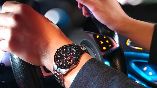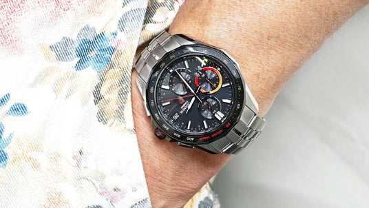 9時側のインダイアルリングに、奥田氏の好むオレンジから赤へのグラデーションを採用。精悍なブラックダイアルに鮮烈なアクセントを添えます。