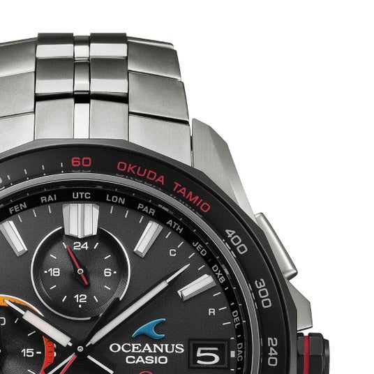 OCEANUS × 奥田民生 ソロ30周年・生誕60周年記念限定モデル。奥田民生氏ソロ活動30周年と生誕60周年を記念した特別なコラボレーションモデルです。妥協なきモノ創りとMade in Japan にこだわるOCEANUSと、音楽へのこだわりと自分らしさを貫き、今なおミュージックシーンの最前線を走り続ける奥田氏の全面監修で仕上げた数量限定モデルです。サファイアガラスベゼルのタキメーターには「OKUDA TAMIO」の文字と生誕60周年を祝い「60」の文字を赤色にした特別仕様。9時側のインダイアルリングは、自身の好きな色であるオレンジと赤のグラデーションデザインを採用しています。ダイアル、りゅうず、中留カバーにはOTマークをデザインし、裏蓋には60歳を表した特別なロゴを刻印しています。専用パッケージをご用意した特別なコラボレーションモデルです。