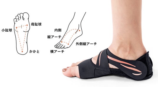 履いた瞬間に沈みがちな足裏アーチを引き上げます。足裏アーチは歩行時に地面から受ける衝撃を受け止めるバネのような働きがあります。足裏アーチが正しく機能せずウォーキングやランニングを続けていると、足だけではなく全身へ衝撃が伝わり、関節の不調につながることもあります。