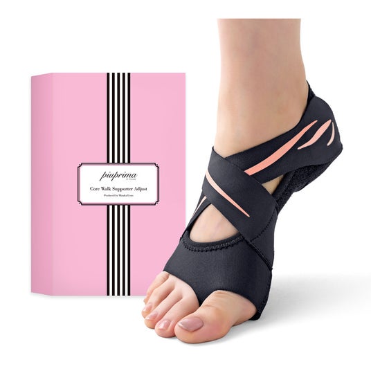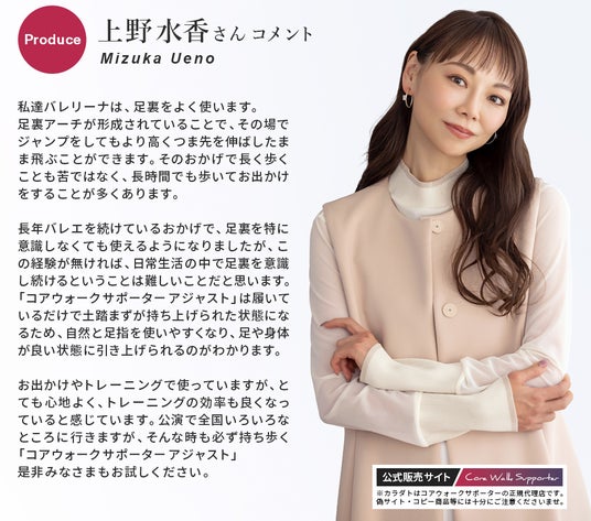 世界的トップバレエダンサーの上野水香が監修。身体を美しく正しく使えるようにバレエダンサーが行う、足指の運動と足裏アーチを形成するトレーニングをもとにコアウォークサポーターアジャストがつくられました。