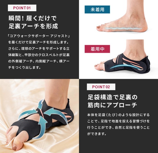 コアウォークサポーターアジャストは、履くだけで足指・足裏の本来持つ機能を高めることを目的につくられたサポーターです。