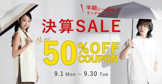 全商品を対象とした「決算セール」を開催中です。最大50%OFFと大変お得にお求めいただける機会となっております。
