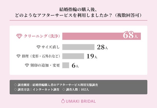 次に「結婚指輪の購入後、どのようなアフターサービスを利用しましたか?(複数回答可)」と質問したところ、最も多かったのは『クリーニング(洗浄)』で、68人の回答でした。続いて、『サイズ直し』(28人)、『修理(変形・石外れなど)』(19人)の順に利用者が多い結果となりました。