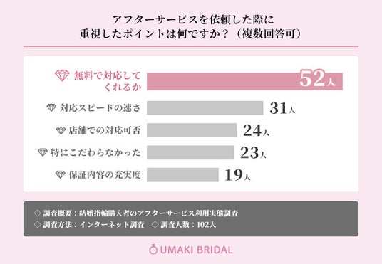 結婚指輪購入後のアフターサービスを選ぶ上で、経済的な負担の有無と、スムーズなサポート体制が重視されていることがわかりました。