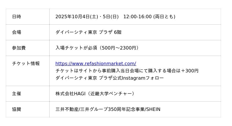 「RE FASHION MARKET」は2025年10月4日(土)、5日(日) ダイバーシティ東京 プラザ6Fにて、