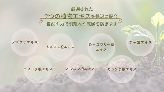 '' 7種の植物エキス+植物オイルが肌をつややかにサポート ''