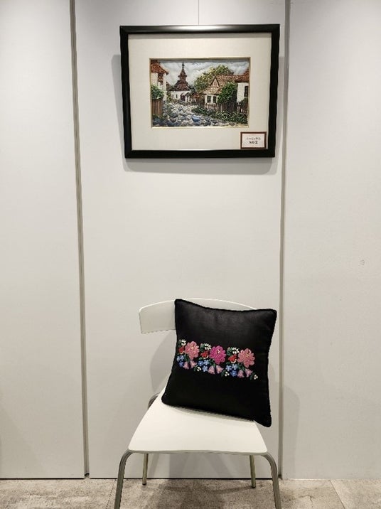 本展では、芸術作品としての刺繍だけでなく、クッションやバッグ、コスメボックスなど、日常を彩るアイテムに施された刺繍作品も展示されています。ハンガリー刺繍が持つ温かみや華やかさは、ファッションだけでなく、クッション、コスメボックスなどインテリアの中でも自然に溶け込み、暮らしにそっと彩りを添えてくれます。手仕事があるだけで、部屋の空気が優しくなる。そんな“暮らしに息づく刺繍の魅力”を、どうぞ会場でご体感ください。