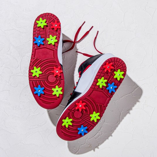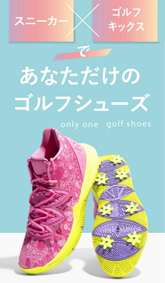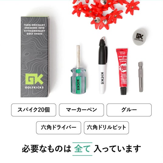 ゴルフキックスは、手持ちのスニーカーにスパイクを取り付け、お気に入りの一足をゴルフシューズにカスタマイズできる商品です。ゴルフシューズを見て、