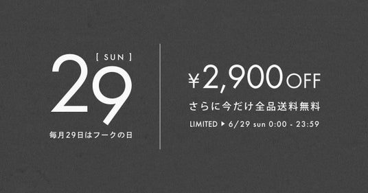 レディースブランドW:Huku(フーク)は、6月29日を「フークの日」として、1日限定の2,900円OFFクーポンを発行いたします。