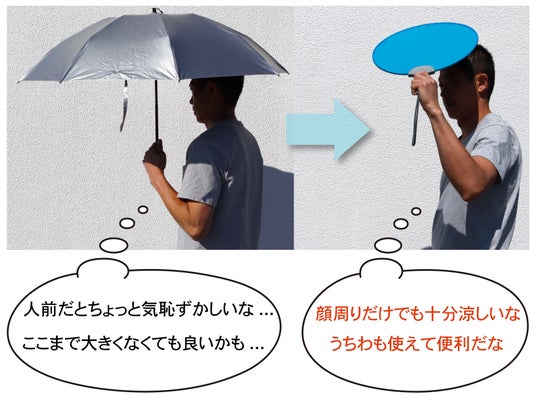 解決策としてのポントシェード: 「日傘を差す」のではなく、「高機能なうちわを掲げる」という新発想。うちわの延長線上でさりげなく使えるので男性の心理的・物理的なハードルを下げました。