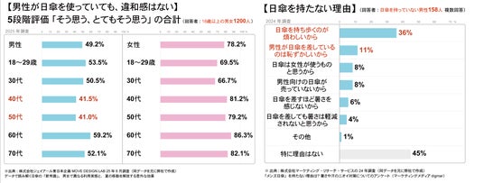 調査結果: 男性の約半数が「他人の日傘使用には違和感がない」と答えながら、自身が使わない理由として「持ち歩きが煩わしい(36%)」「差すのが恥ずかしい(11%)」と回答。