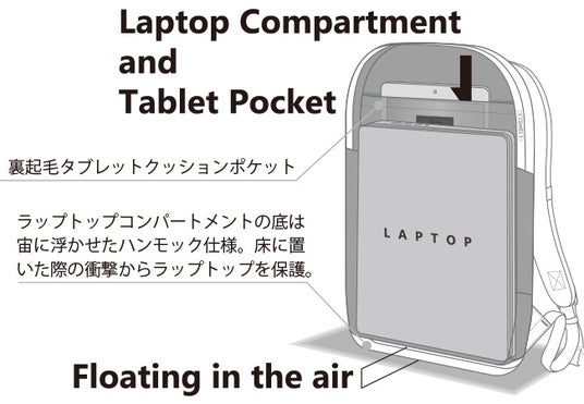 PCルームの底面は宙に浮かせたハンモック仕様。床に置いた際の衝撃から大切なPCを守ります。16インチ+14インチPC、2台を入れてもまだゆとりのある大容量。A4サイズの書類を一緒にいれることもおすすめです。防水性の高いYKK止水ファスナーを採用しています。