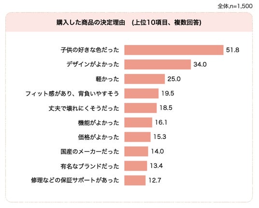 昨年同様にランドセル購入の決め手は「子どもの好きな色かどうか」が最も重視されています。次いで「デザイン」となり購入前と購入後では変化が起きています。近年はカラーだけではなく細かい刺繍やステッチ、部品でもある鋲なども各社メーカーによってさまざまなデザインがあり、幅が広がったことでよりお子様の個性を尊重される方が増えている傾向です。一方機能性の項目は「軽さ」はある程度重視されつつも、そのほかは軒並み微減、横ばいといった結果になりました。
