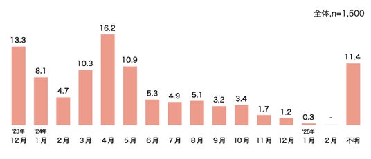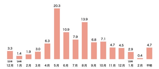なお、実際に購入した時期は5月・8月が多く、ランドセルの支払いを祖父母がする場合も多いこともあり大型連休や夏休みのタイミングが多くなっていると考えられます。