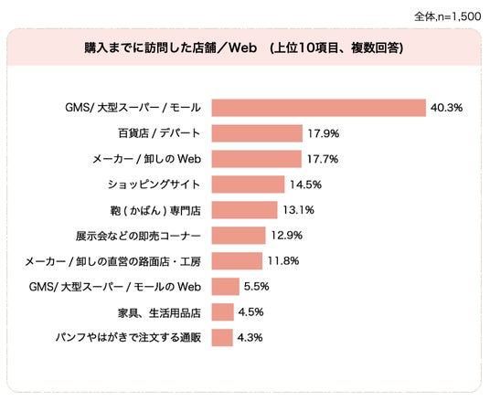 ・検討・購入に際して訪れた場所は大型スーパーやショッピングモールが多く、実際に見て、手に取って、背負ってから購入する方が多い。