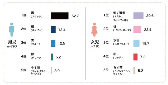 女の子は、「紫/薄紫(スミレ、ラベンダー等)」 が引き続き最多で拡大基調。「桃(ピンク、ローズ)」「水色(スカイブルー)」も年々増加傾向にあります。かつて定番だった「赤」は4位で昨年から3.3%も減少。 今年も男女ともに5位にランクインした「うす茶(ライトブラウン、キャメル) 」は、性別を問わず人気のある色だといえます。